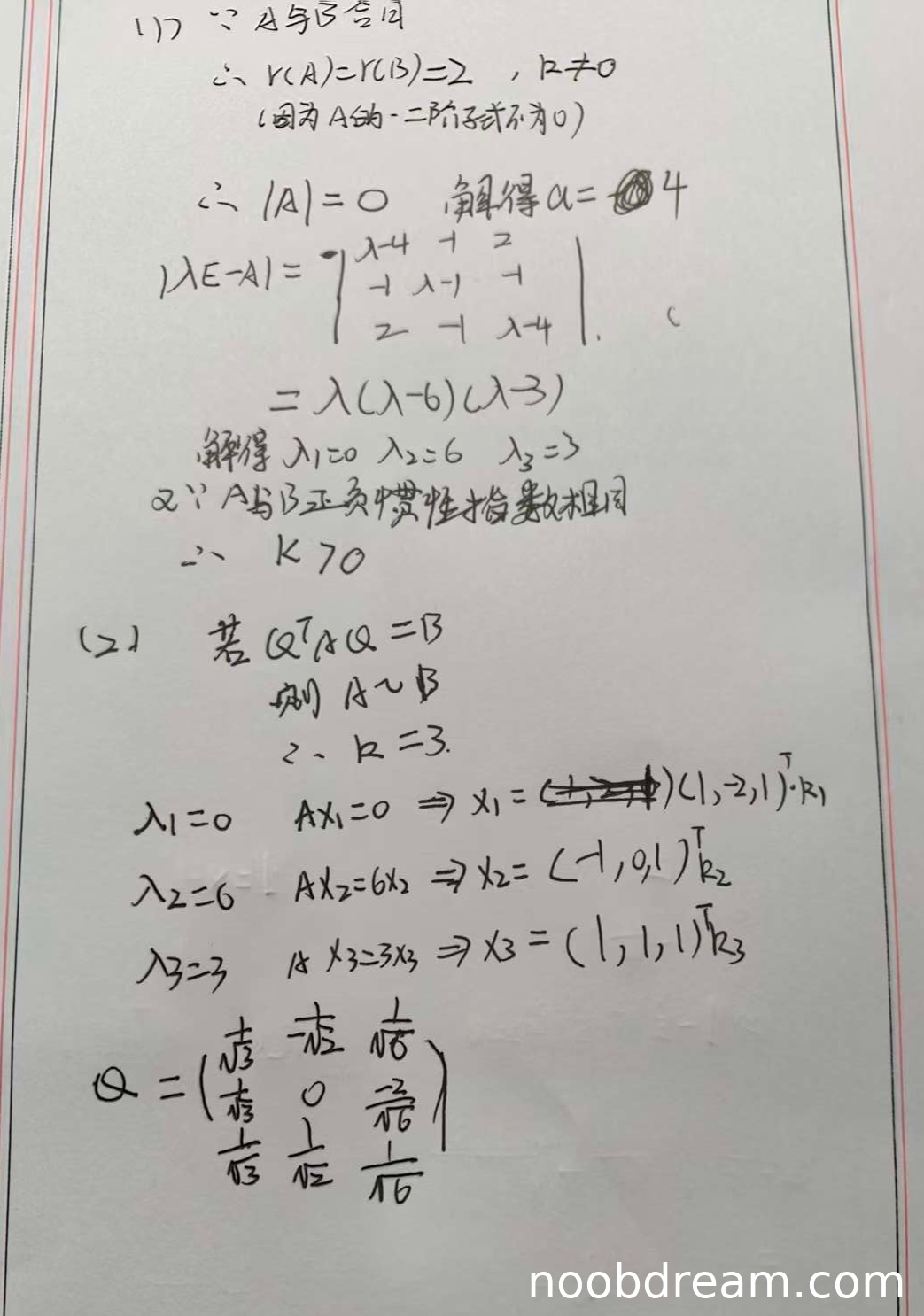 学生作答中,第一次识别结果与第二次识别结果在特征多项式展开和特征值计算上存在不一致(第一次正确,第二次有误),但根据“只要其中有一次回答正确则不扣分”的原则,以正确的一次为准。学生正确得出 a=4,特征值为 0, 3, 6,并判断 k>0。但学生给出的理由“r(A)=r(B)=2,k≠0(因为A的二阶子式不为0)”存在逻辑瑕疵:合同矩阵秩相等是正确的,但“k≠0”的理由不充分(实际上k可以为零,但结合特征值分析后k>0)。不过,最终结论正确。因此扣1分。得5分。