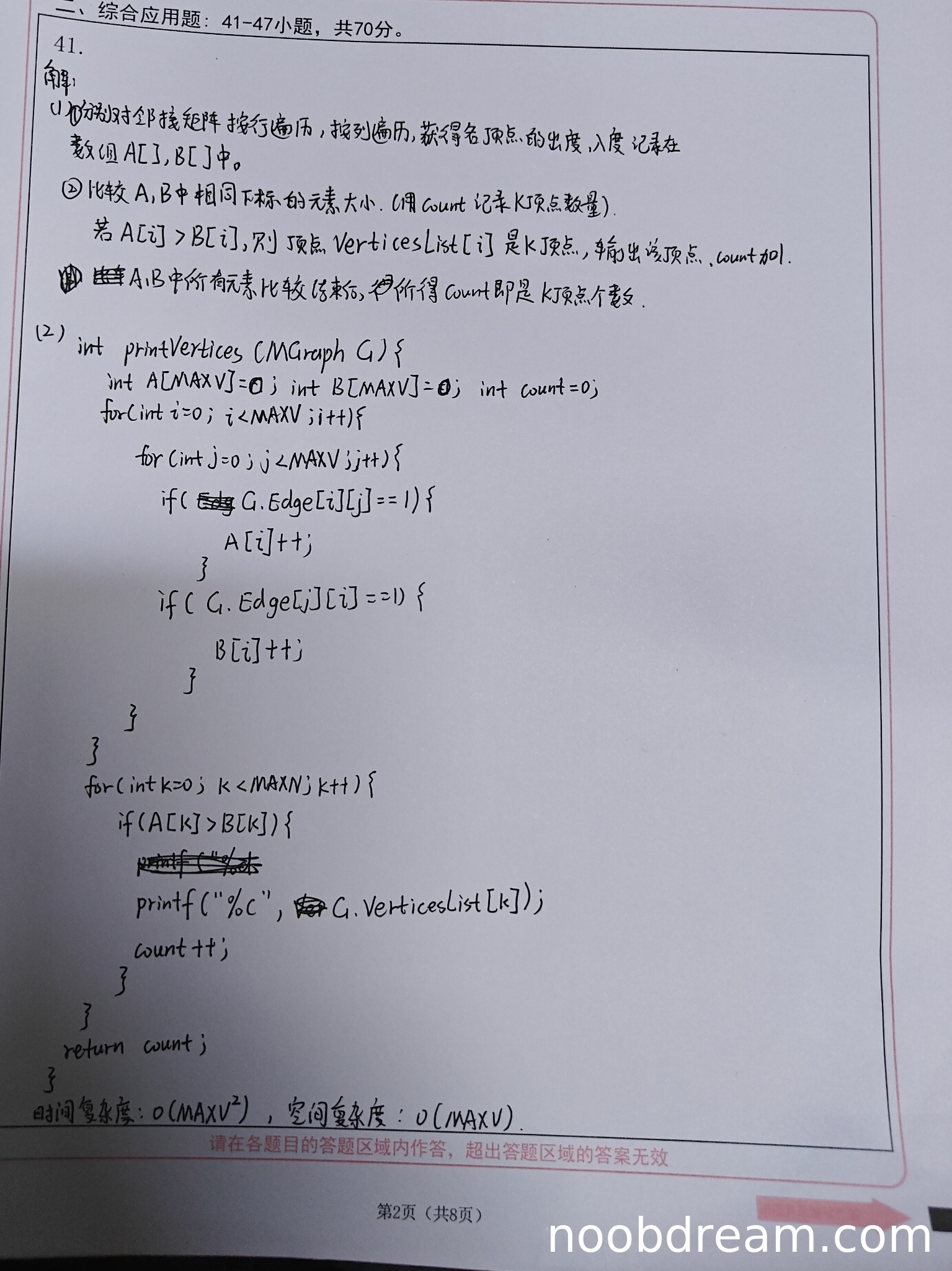 int A[MAXV]=0; 语法错误(应为 int A[MAXV]={0}; 或类似方式),但根据两次识别结果,第一次识别为正确初始化,第二次识别可能为笔误或识别错误。结合“禁止扣分”原则中关于误写不扣分的规定,且核心逻辑正确,此处不扣分。MAXV 而非图中实际顶点数 G.numVertices,这会导致对无效部分的遍历,虽然不影响结果但效率略低。标准答案使用了 G.numVertices 作为边界,更为准确。但题目未明确要求必须按实际顶点数遍历,且算法思想正确,此处视为可接受的小瑕疵,不扣分。MAXN,这可能是笔误(应为 MAXV 或 G.numVertices),但第二次识别已修正为 MAXV。根据“禁止扣分”原则中关于误写不扣分的规定,不扣分。代码核心逻辑(统计出度、入度,比较并输出)完全正确,注释虽未添加但题目未强制要求,且算法功能能正确实现。因此扣0分,得满分9分。