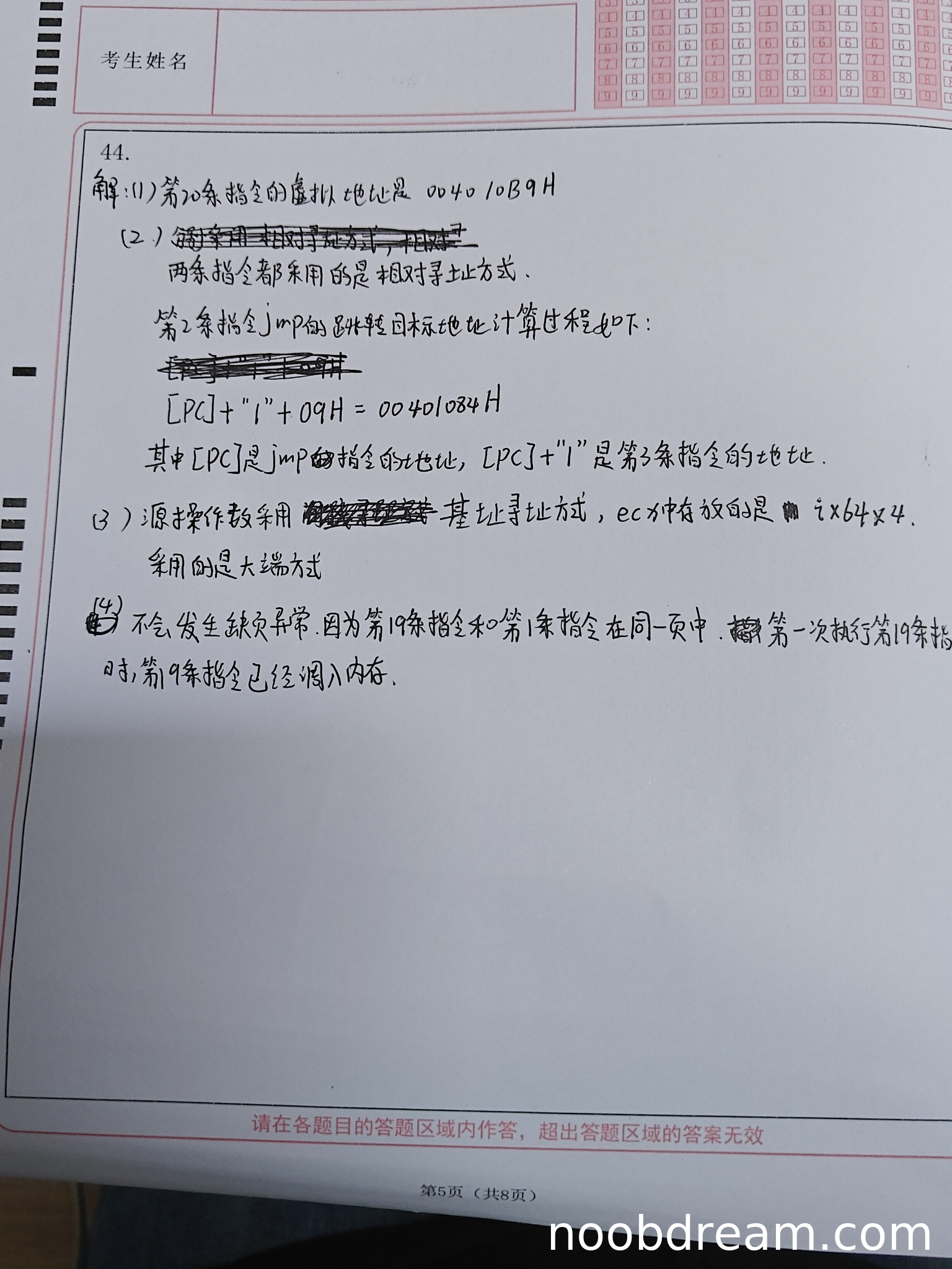 第二问:学生给出了计算过程,但表述“[PC]+"1"+09H = 00401084H”不严谨,且未明确说明PC更新和下一条指令地址的计算。标准答案要求明确计算步骤(PC+指令长度+偏移量)。考虑到学生思路基本正确(指出了偏移量09H),但过程描述不完整,扣1分。得2分。