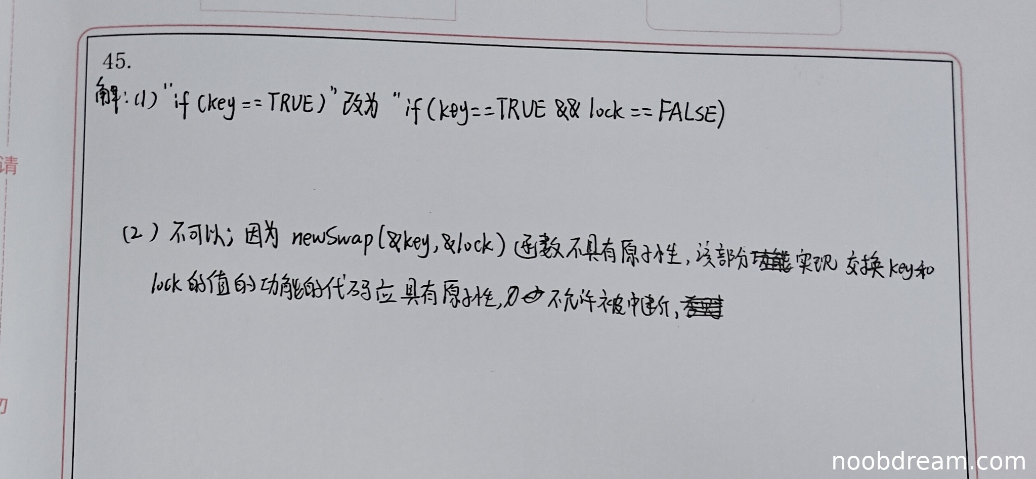 学生正确回答了“不可以”,并给出了理由:因为newSwap函数不具有原子性,而实现交换功能的代码应具有原子性,不允许被中断。这个理由与标准答案的核心观点一致,即非原子操作可能导致多个线程同时进入临界区。因此,该部分回答正确。得3分。
