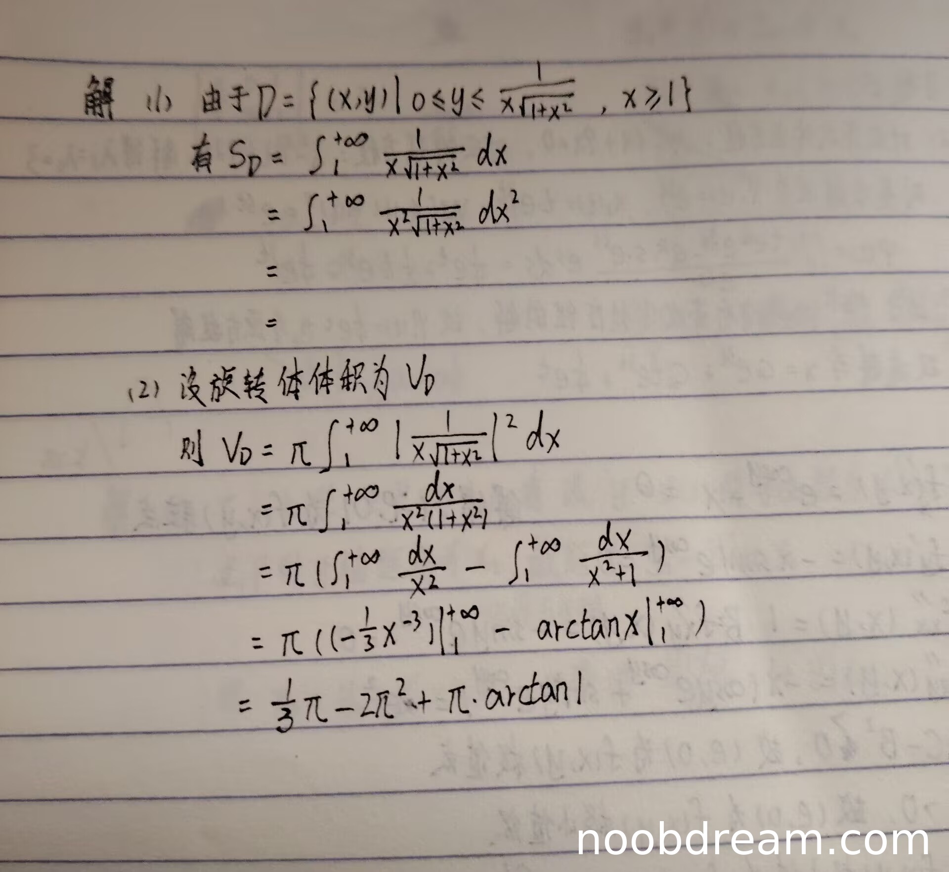 学生作答中,第1次识别结果在体积计算部分,积分拆分为 \(\frac{1}{x^2}\) 和 \(\frac{1}{x^2+1}\) 是正确的,但积分计算出现严重错误:将 \(\int \frac{dx}{x^2}\) 错误积分成 \(-\frac{1}{3}x^{-3}\),导致后续计算错误。第2次识别结果中,积分拆分正确,且积分计算修正为 \(\int \frac{dx}{x^2} = -\frac{1}{x}\),这是正确的。然而,在代入上下限计算时,过程混乱,最终表达式 \(\frac{1}{4}\pi - 2\pi^{2}+\pi\cdot\arctan1\) 是错误的,但旁边给出了正确的计算过程和结果 \(\pi(1-\frac{\pi}{4})\)。根据“只要其中有一次回答正确则不扣分”的原则,第2次识别结果中包含了正确的计算过程和结果,因此应视为正确。但需注意,学生最终写出的答案表达式仍是错误的,而正确结果是作为注释给出的。根据整体判断,核心逻辑(积分公式、拆分、计算)在第2次识别中已正确体现,且最终正确结果已给出,因此不扣分。得分:6分。