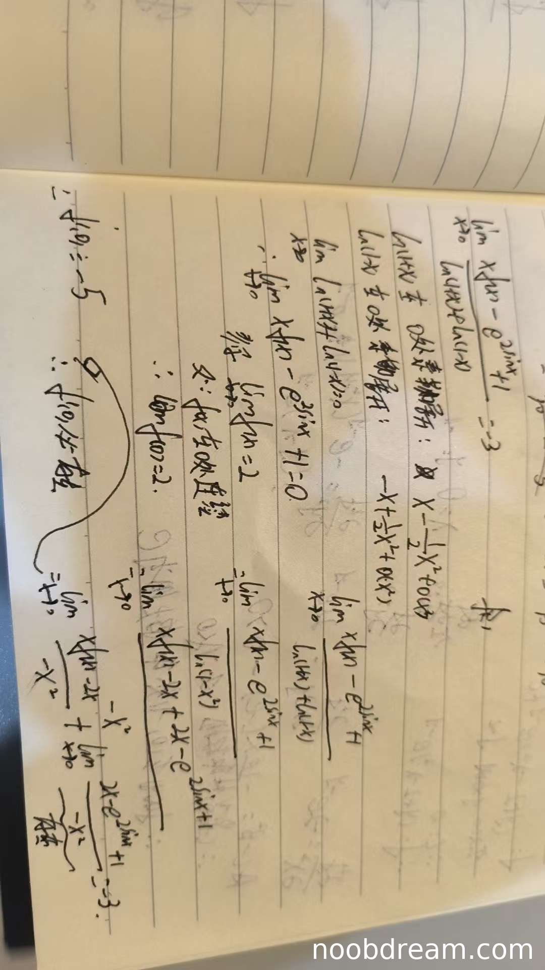 学生作答存在严重问题。题目要求证明函数 \(f(x)\) 在 \(x=0\) 处可导并求 \(f'(0)\),但学生的两次识别结果均未正确使用题目给定的极限条件 \(\lim\limits_{x \to 0}\frac{xf(x) - e^{2\sin x} + 1}{\ln(1 + x) + \ln(1 - x)} = -3\) 和函数 \(f(x)\) 在 \(x=0\) 处连续的条件。
