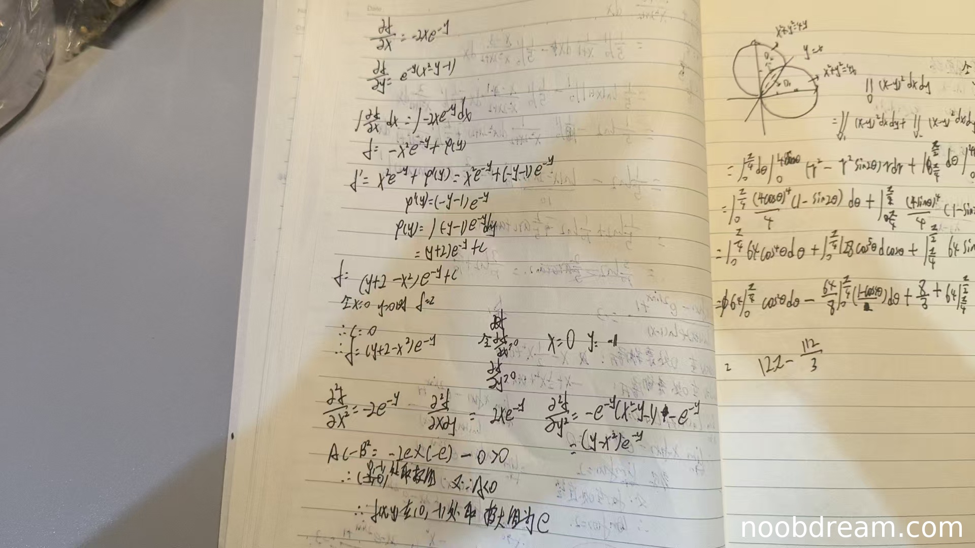 学生第一次识别结果中,对 \( \frac{\partial f}{\partial y} \) 的识别有误,写为 \( e^{-y}(x + y - 1) \),但后续推导中实际使用的是 \( e^{-y}(x^2 - y - 1) \)(从 \( \varphi'(y) = (-y-1)e^{-y} \) 可反推),且最终得到正确表达式 \( f = (y+2-x^2)e^{-y} \)。第二次识别结果中,\( \frac{\partial f}{\partial y} \) 正确,推导过程完整,且利用 \( f(0,0)=2 \) 正确求出常数 \( C=0 \),得到正确结果 \( z = (y+2-x^2)e^{-y} \)。根据“两次识别只要有一次正确则不扣分”的原则,此处不扣分。但第一次识别中部分步骤书写混乱(如 \( \int \frac{dt}{dx} dx = \int \frac{1}{1 - 2xe^{-y}} dt \) 无意义),但最终结果正确,且第二次识别过程清晰正确,因此不扣分。得6分。