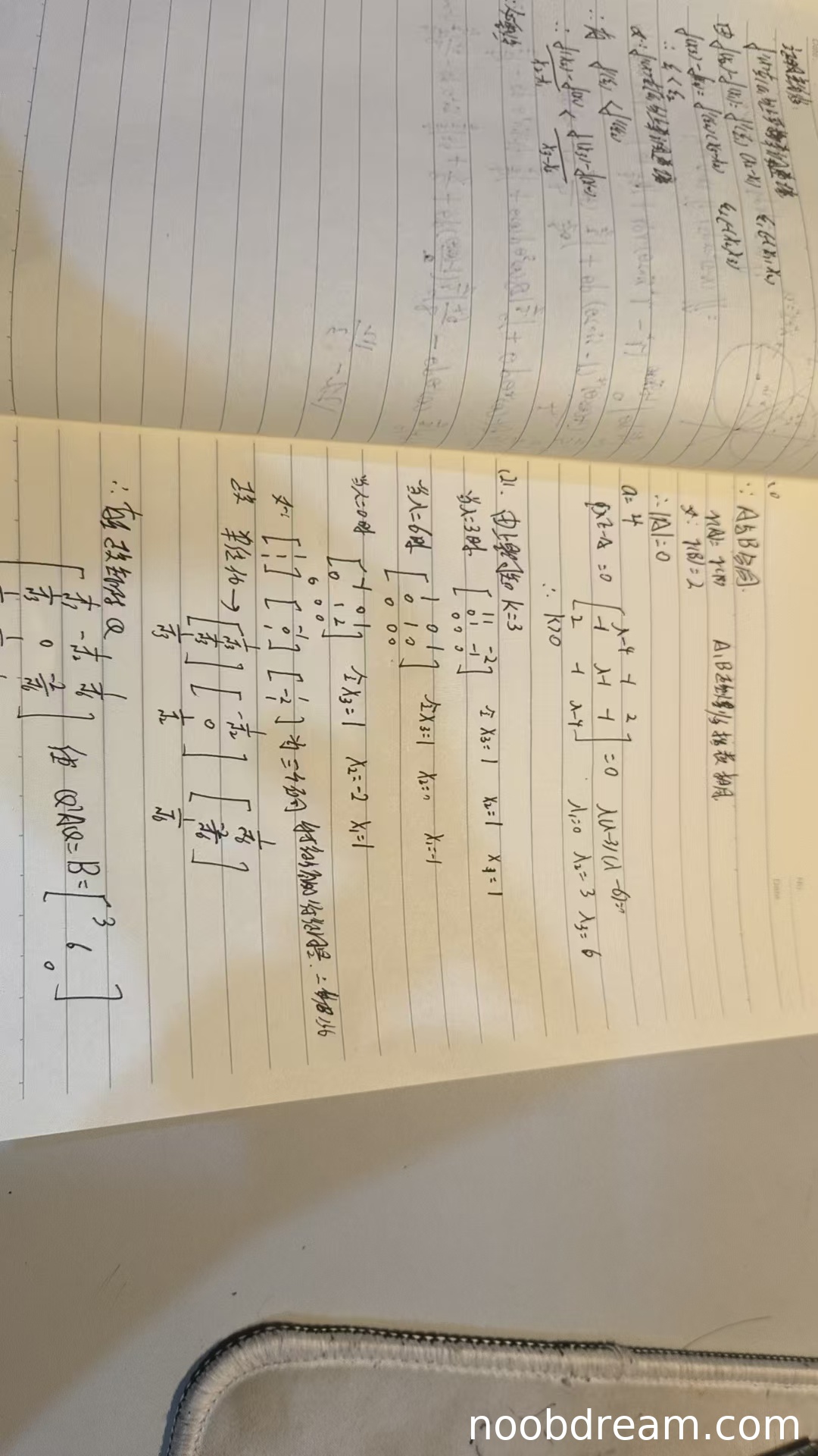 学生作答中,第1次识别结果提到了“∵AB合同 ∴tr(AB)=tr(A) A,B对称⇒A,B相似 tr(A)=tr |A|=0 a=4”。这里存在多处逻辑错误和表述不清: 1. “tr(AB)=tr(A)” 没有依据,合同矩阵的迹不一定相等。 2. “A,B对称⇒A,B相似” 错误,对称矩阵合同不一定相似,相似要求特征值完全相同。 3. “tr(A)=tr” 表述不完整。 然而,学生正确地得到了 |A|=0 并计算出 a=4。在计算特征多项式时,行列式展开有误(符号错误),但最终得到了特征值 λ(λ-3)(λ-6)=0,并指出特征值为 3, 3, 6(这里写成了两个3,一个6,与标准答案的3,6,0不符,但可能是笔误,因为前面有λ=0的因子)。随后学生说“由上题知k=3”,但并未给出k的取值范围推理过程。第1问要求求a的值及k的取值范围,学生只给出了a=4和k=3(具体值),没有说明k>0的取值范围,且推理过程存在严重逻辑错误。因此,第1问只能给予部分分数。考虑到a值计算正确,但k的推理和范围缺失或错误,扣分较多。给分:2分(满分6分)。