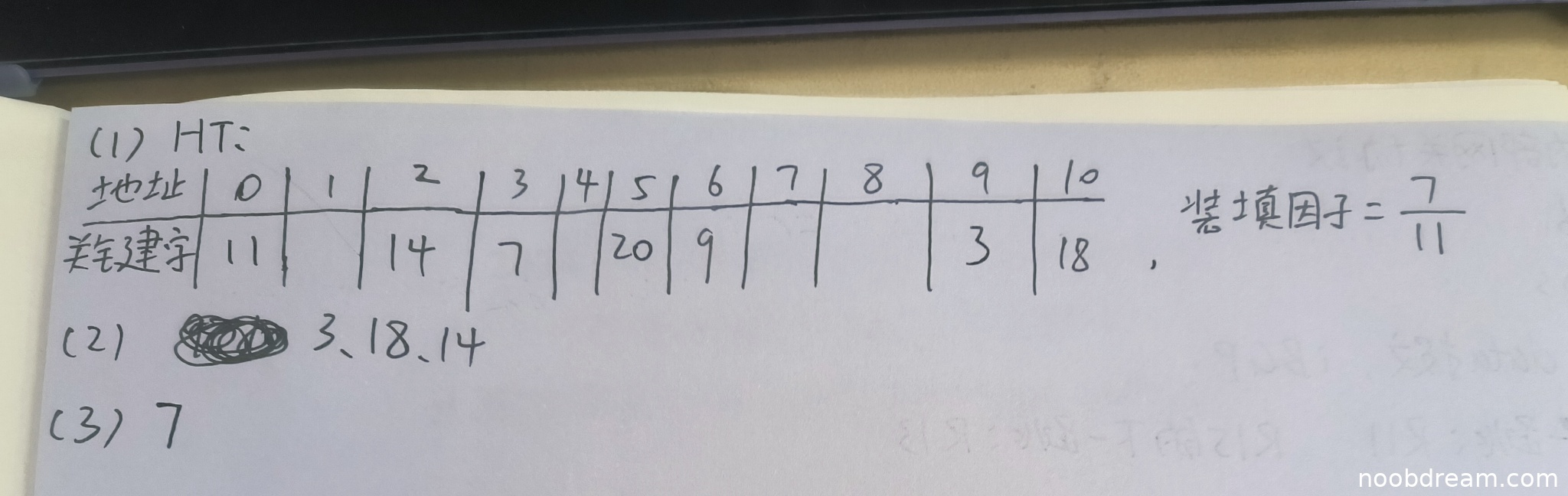 学生答案给出了散列表HT的最终状态:地址0到10对应的关键字依次为11、(空)、14、7、(空)、20、9、(空)、(空)、3、18。这与标准答案完全一致。装填因子计算为7/11,也正确。因此,本小题得满分6分。