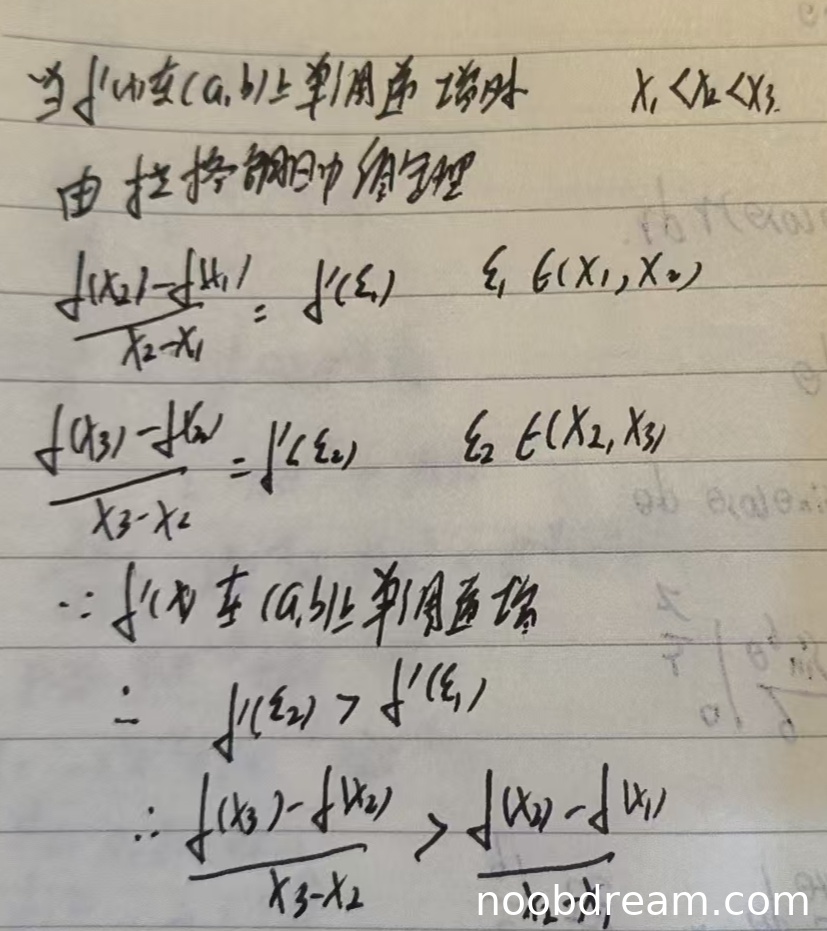 学生正确运用了拉格朗日中值定理,将两个差商表示为导数形式。逻辑上,由导函数严格单调递增(学生表述为“f(x)在(a,b)上单调递增”,此处应理解为导函数f'(x)单调递增,根据上下文判断为表述不严谨但核心意思正确,属于可接受的误写或简写),得出f'(ξ₂) > f'(ξ₁),从而推出所需不等式。证明思路清晰、正确。因此,必要性部分可得满分6分。