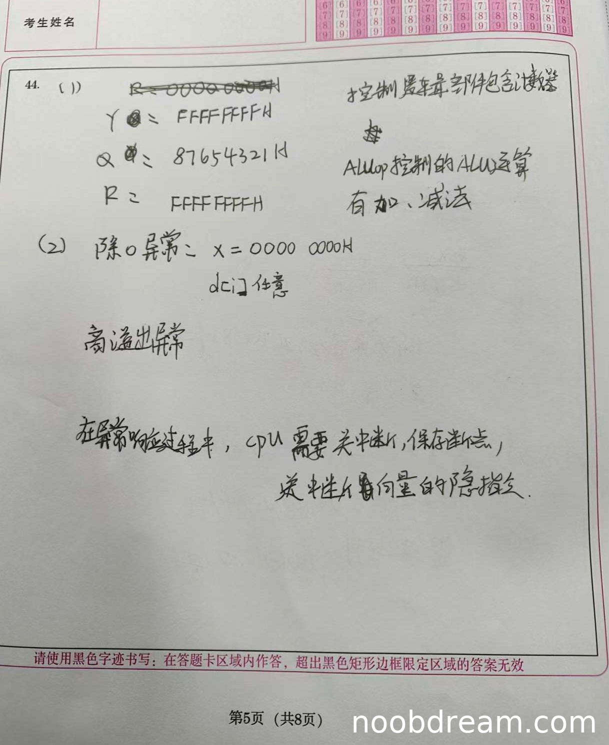 扣分点:溢出异常情况未给出具体数值(-1分),异常响应过程描述不完整(-1分)。本小题得分为:5 - 1 - 1 = 3分。