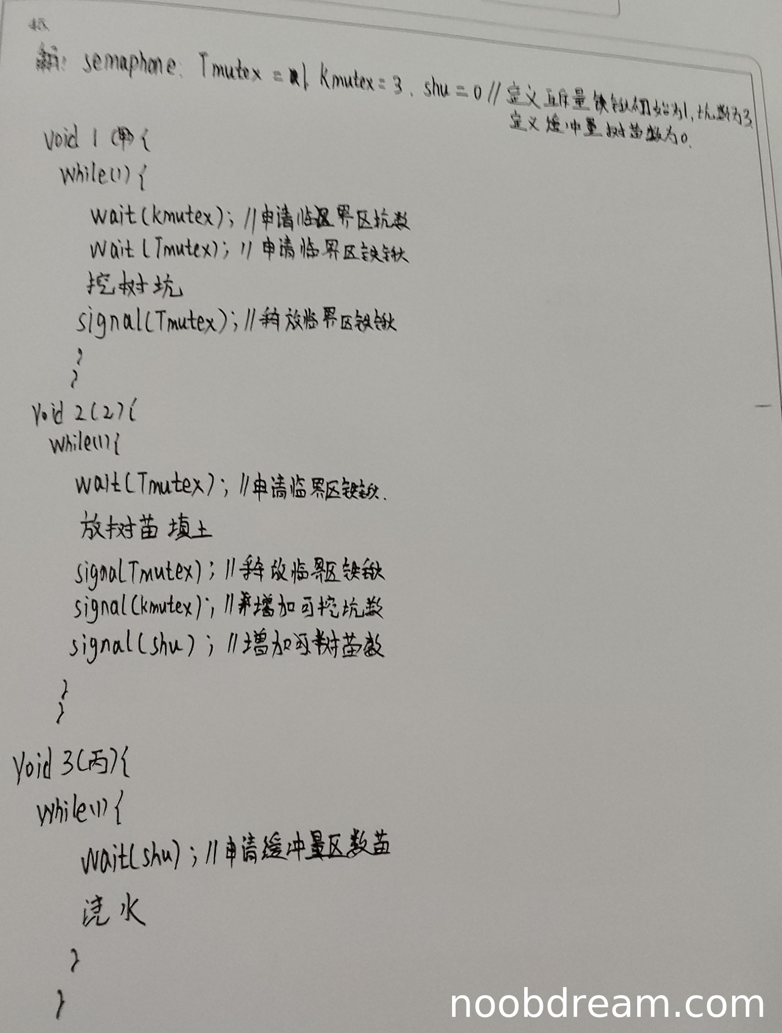 - 扣分:本题考察同步互斥关系的完整建模。学生答案未能正确描述“挖坑-放树苗填土”这一必需的前后顺序,属于重大逻辑错误。考虑到部分信号量(Tmutex, shu)设置正确,且丙的流程正确,给予一定的步骤分。