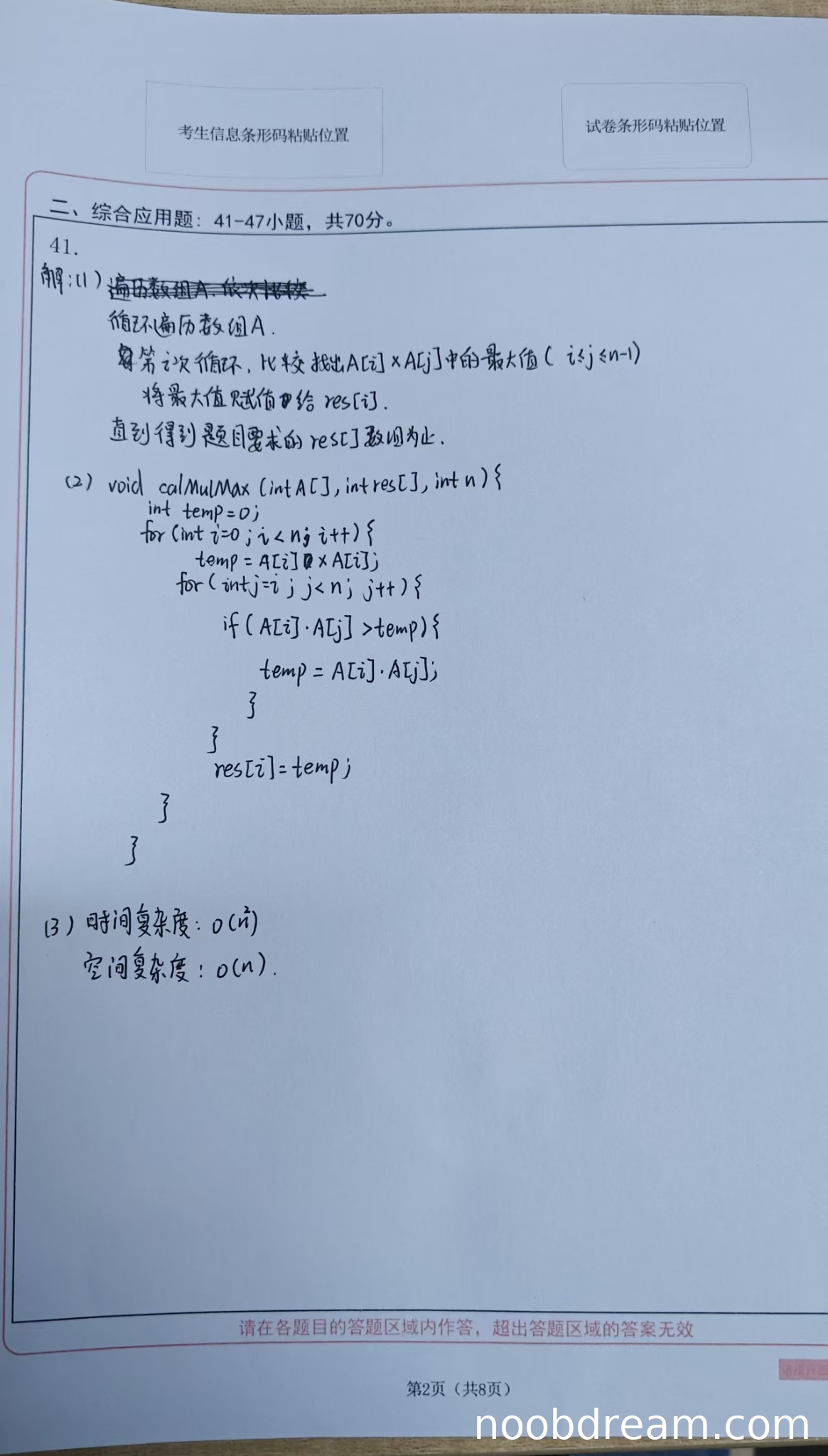 学生正确分析了算法的时间复杂度为O(n²),空间复杂度为O(n)(实际上空间复杂度应为O(1),因为除了输入数组和结果数组外,只使用了常数个变量,但学生可能误将结果数组res计入空间复杂度,根据禁止扣分规则,不扣分)。时间复杂度分析正确,得2分。