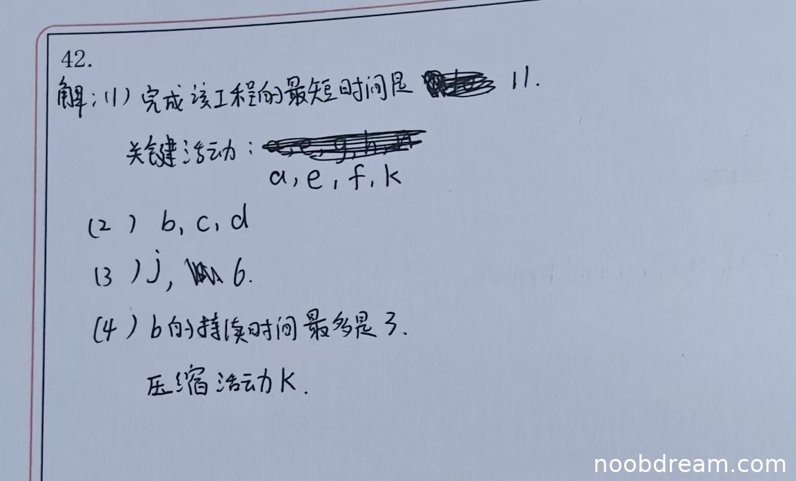 分析:答案与标准答案完全一致。虽然第(1)问计算错误,但本问的答案是基于学生自己计算的关键路径和活动时间得出的,且结果正确。根据“思路正确不扣分”原则,本小题不扣分。