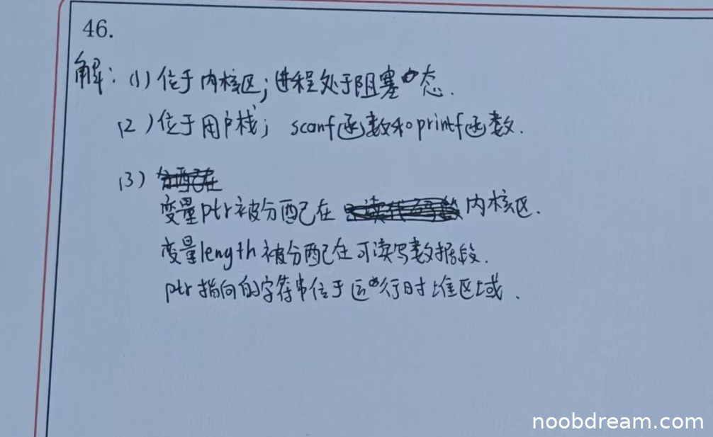 学生答案:进程控制块位于内核区,执行scanf时进程处于阻塞态(或阻塞状态)。