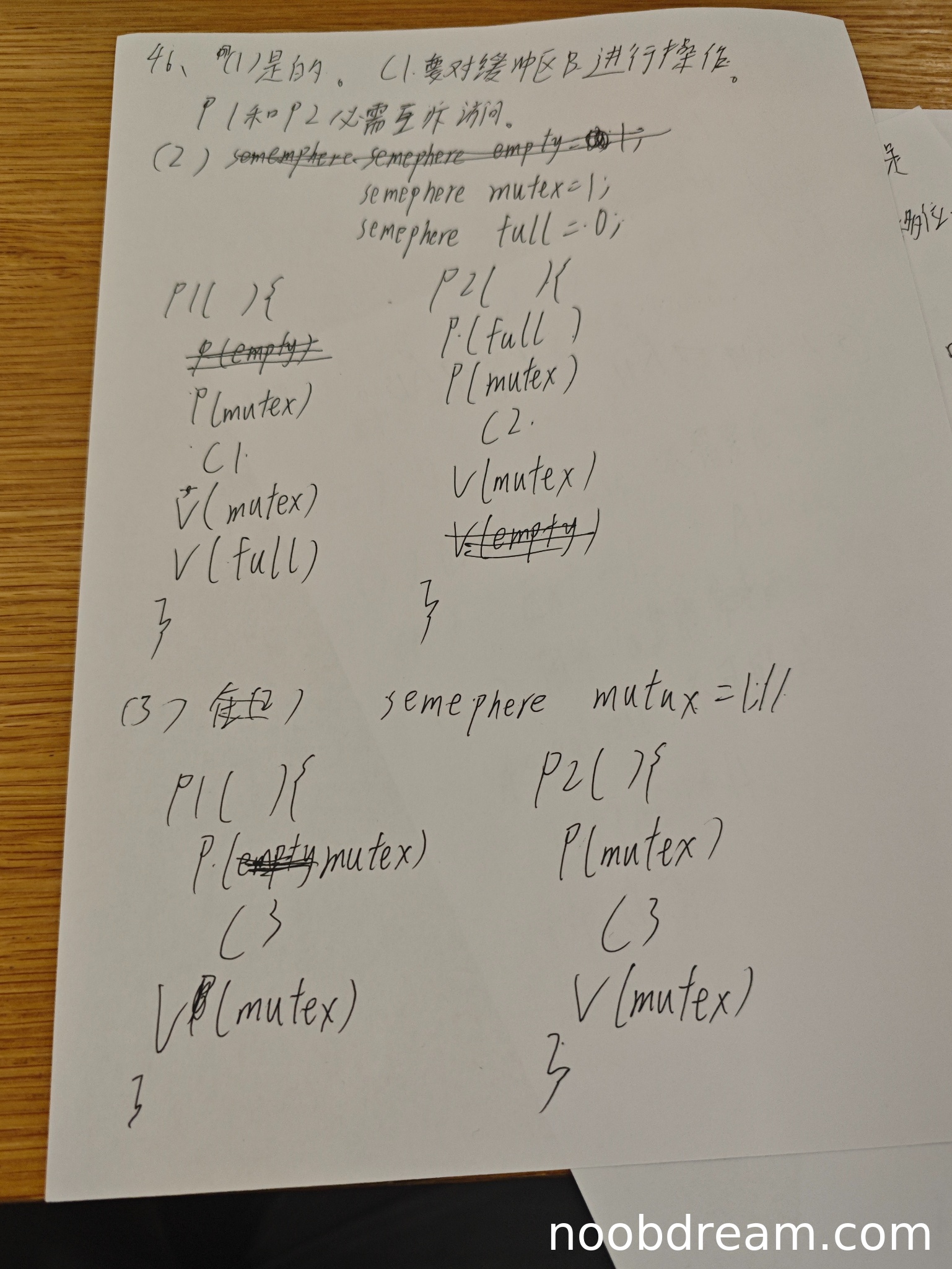 学生定义了一个信号量mutex=1,并在P1和P2中正确使用P(mutex)和V(mutex)包裹C3操作。这确保了多个进程对缓冲区B的修改操作(C3)互斥进行,符合题目要求(B非空时才能执行C3,但互斥是主要需求)。学生的第二次识别结果中P1的代码“P(mutex)”正确(第一次识别中的“P(empty, mutex)”可能是识别错误,但以第二次为准)。逻辑正确。得3分。