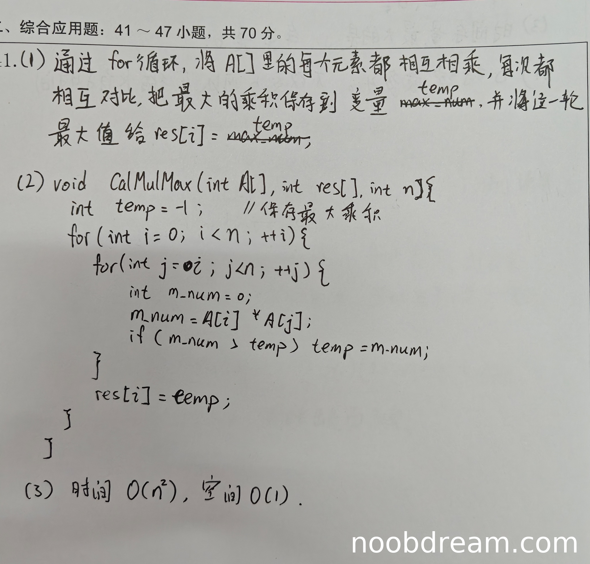 学生作答的基本设计思想是:对每个A[i],通过双重循环计算A[i]与所有A[j](j从i到n-1或从0到n-1)的乘积,并记录最大值存入res[i]。这一思路虽然正确,但时间复杂度为O(n²),不是题目要求的“尽可能高效的算法”。标准答案的O(n)算法利用了从右向左遍历并维护最大值和最小值的技巧,显著更优。学生的思路属于暴力解法,虽然能得到正确结果,但效率较低,未达到题目对“高效”的要求。因此扣2分,得2分。