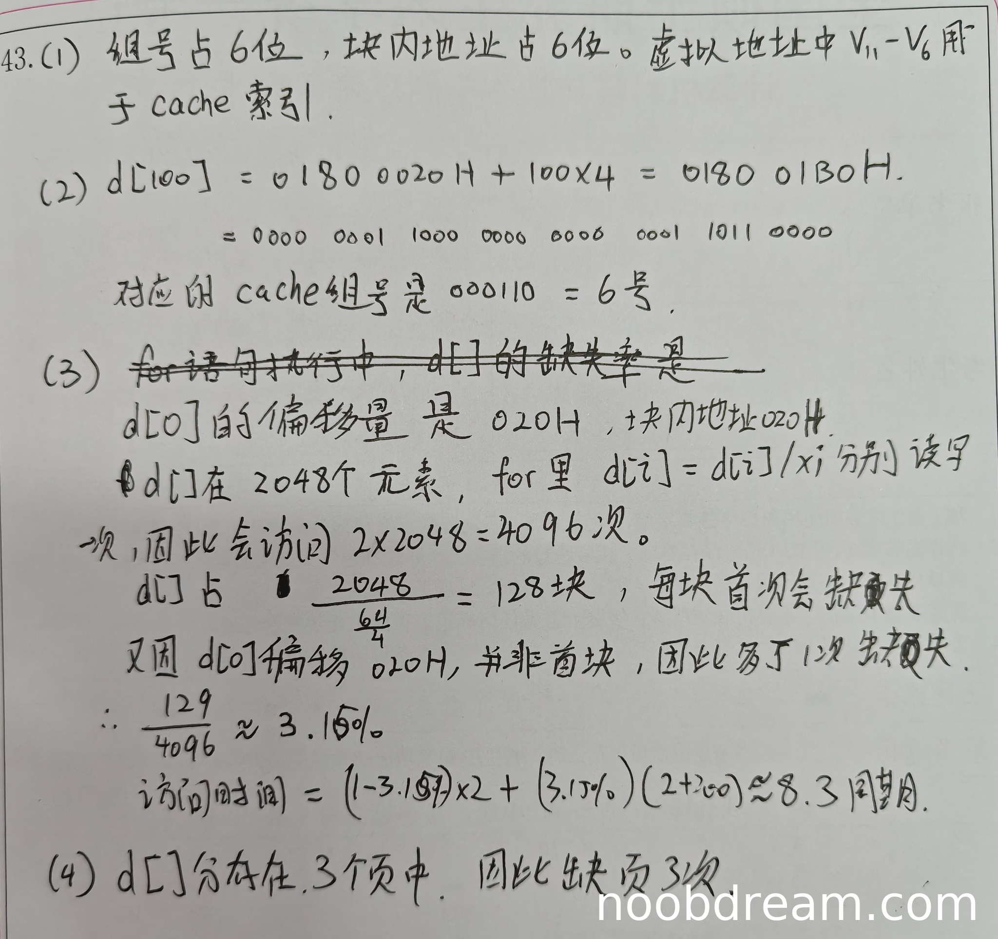 2. 计算缺失率时,正确指出总访问次数为4096次(2048次读+2048次写),并正确分析出由于d[0]偏移非块对齐导致额外缺失,最终缺失块数为129,缺失率≈3.15%,计算正确,得3分。