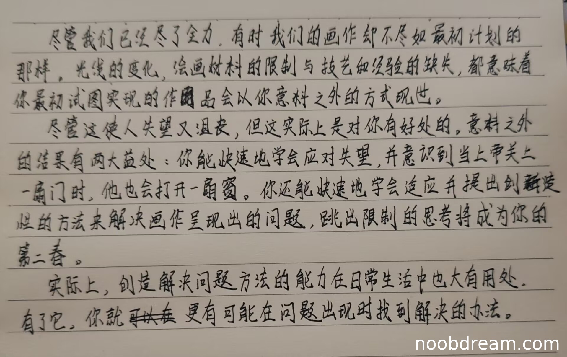 - 优点:译文结构清晰,用词得当。如“尽管我们已经尽了全力”、“光线的变化,绘画材料的限制与技艺和经验的缺失”等处理准确自然。“当上帝关上一扇门时,他也会打开一扇窗”是对“when one door closes, another opens”的常见且达意的中文习语化处理。
