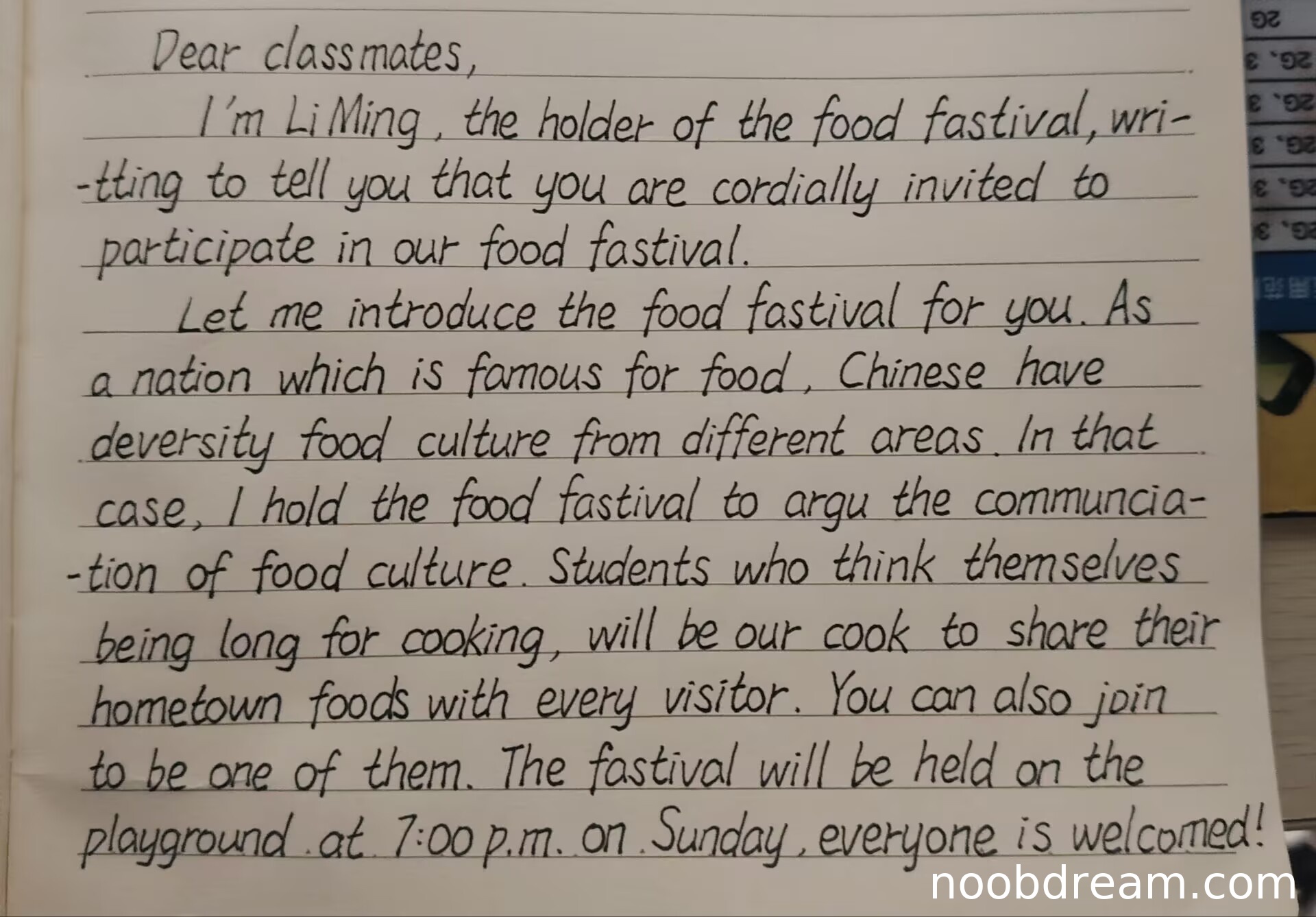 格式与语域:格式正确,包含称呼(Dear classmates)、正文、结束语(Yours)和署名(Li Ming)。语域基本恰当,介于正式与非正式之间,符合同学间通知的语境。但“the holder of the food festival”略显生硬,更地道的说法是“the organizer”。