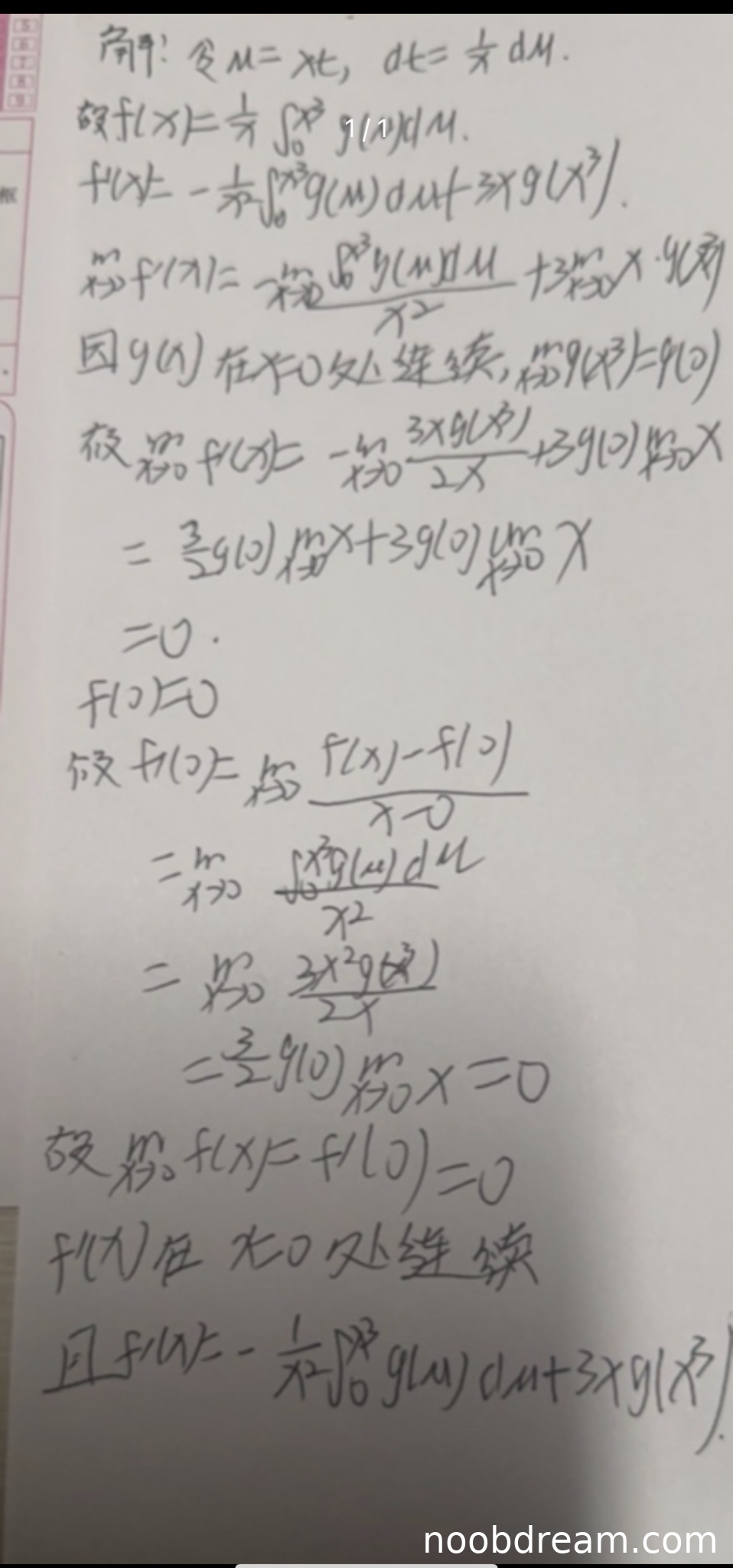 - 在第二次识别中,计算 \( f'(0) \) 时,错误地写为 \( \lim_{x \to 0} \frac{\int_0^{x^3} g(u) du}{x^3} \),分母应为 \( x^...