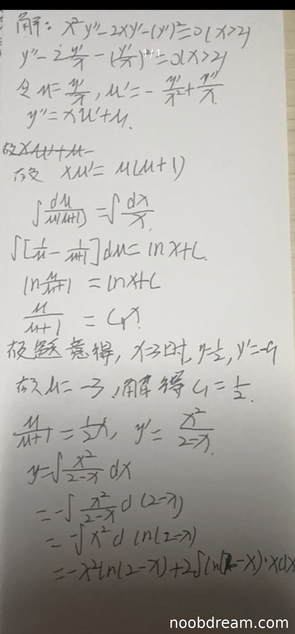 - 由 \( \frac{u}{u+1} = \frac{x}{2} \) 解得 \( y' = \frac{x^2}{2-x} \),正确。
