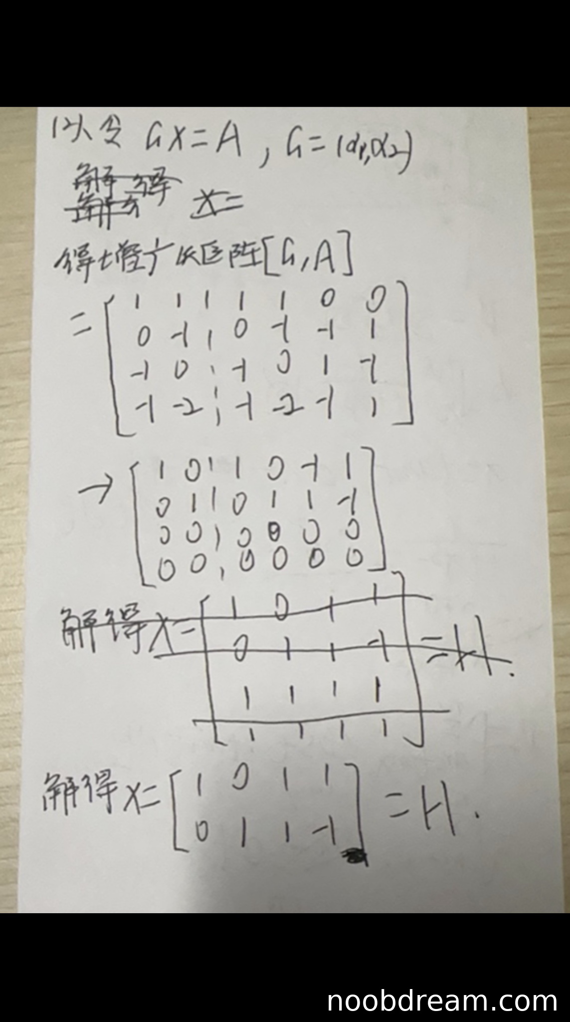 学生设 \(GX = A\),通过增广矩阵 \([G, A]\) 行变换求解 \(X\)(即 \(H\))。第一次识别结果中,增广矩阵书写有误(列数不对,应为4列,但写了6列),但行变换后得到 \(X = \begin{pmatrix} 1 & 0 & 1 & 1 \\ 0 & 1 & 1 & -1 \end{pmatrix}\),这与标准答案 \(H = \begin{pmatrix} 1 & 0 & -1 & 1 \\ 0 & 1 & 1 & -1 \end{pmatrix}\) 相比,第3列不同(学生是1,1,标准是-1,1)。这可能是计算错误或识别错误。由于题目要求求 \(A^{10}\),若H错误会导致后续计算错误,但学生答案中未给出 \(A^{10}\) 的计算,因此(2)部分只评价求H的过程。H的结果有误,但思路正确(用线性表示求系数矩阵),且部分正确(第1,2,4列正确)。根据部分正确的情况,给予部分分数,扣2分。得4分。