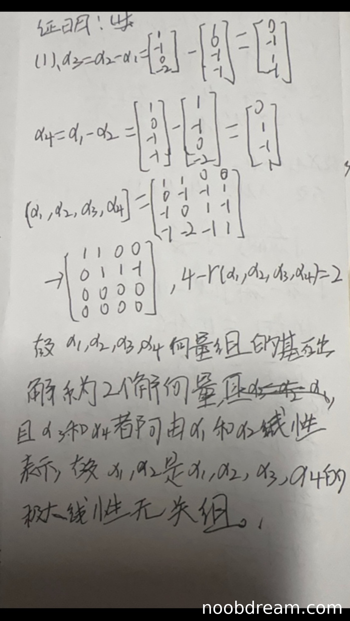 学生作答中,第一次识别结果给出了对矩阵A进行初等行变换的过程,并得出秩为2,且指出α₁,α₂线性无关,从而证明它们是极大线性无关组。思路正确,但变换结果与标准答案不完全一致(标准答案化为行最简形是 \(\begin{pmatrix} 1 & 0 & -1 & 1 \\ 0 & 1 & 1 & -1 \\ 0 & 0 & 0 & 0 \\ 0 & 0 & 0 & 0 \end{pmatrix}\),学生第一次识别结果为 \(\begin{pmatrix} 1 & 1 & 0 & 0 \\ 0 & 1 & 1 & -1 \\ 0 & 0 & 0 & 0 \\ 0 & 0 & 0 & 0 \end{pmatrix}\),这仍是阶梯形,秩为2的判断正确)。不过学生在证明开头写“设 \(a_3 = a_2 - a_1\)”等表达式有误(向量写错),但后续矩阵写的是正确的,可能是识别误差。整体逻辑正确,结论正确。第二次识别结果中向量计算明显有误(如α₃计算错误),但根据“只要其中有一次回答正确则不扣分”的原则,以第一次识别为准。因此(1)部分给满分6分。