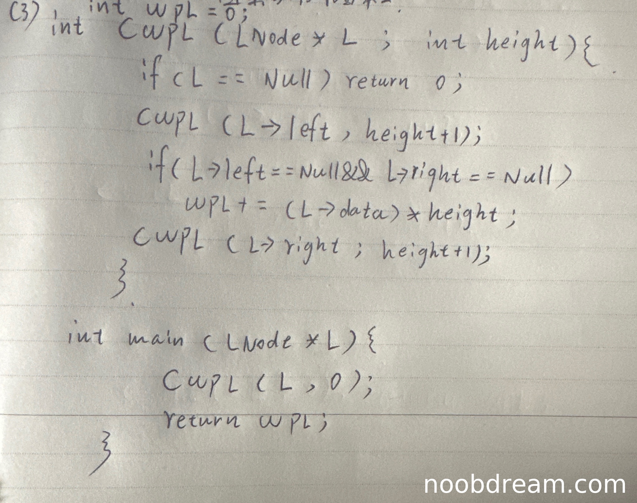 得分:3分。理由:学生代码整体框架体现了先序遍历递归计算WPL的思想,递归结构基本正确,并在叶子结点处进行累加。但存在以下逻辑错误和问题: