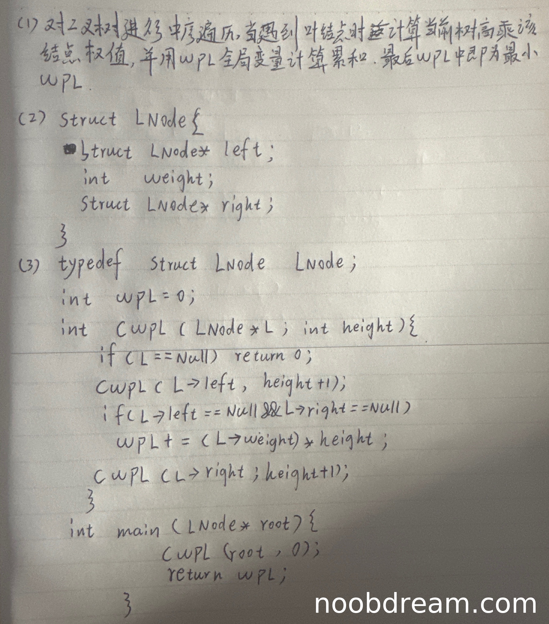理由:学生代码整体框架正确,采用中序遍历递归计算WPL,并使用了全局变量wpl和深度参数height。主要扣分点如下: