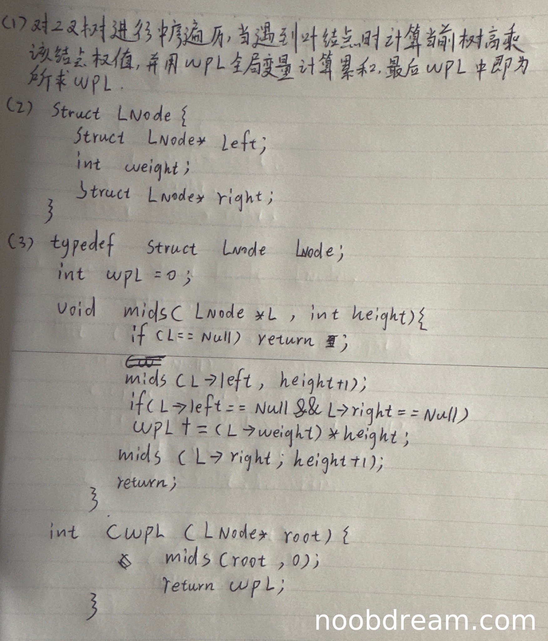 学生给出的算法代码整体思路正确,通过递归中序遍历计算WPL。但存在以下问题: