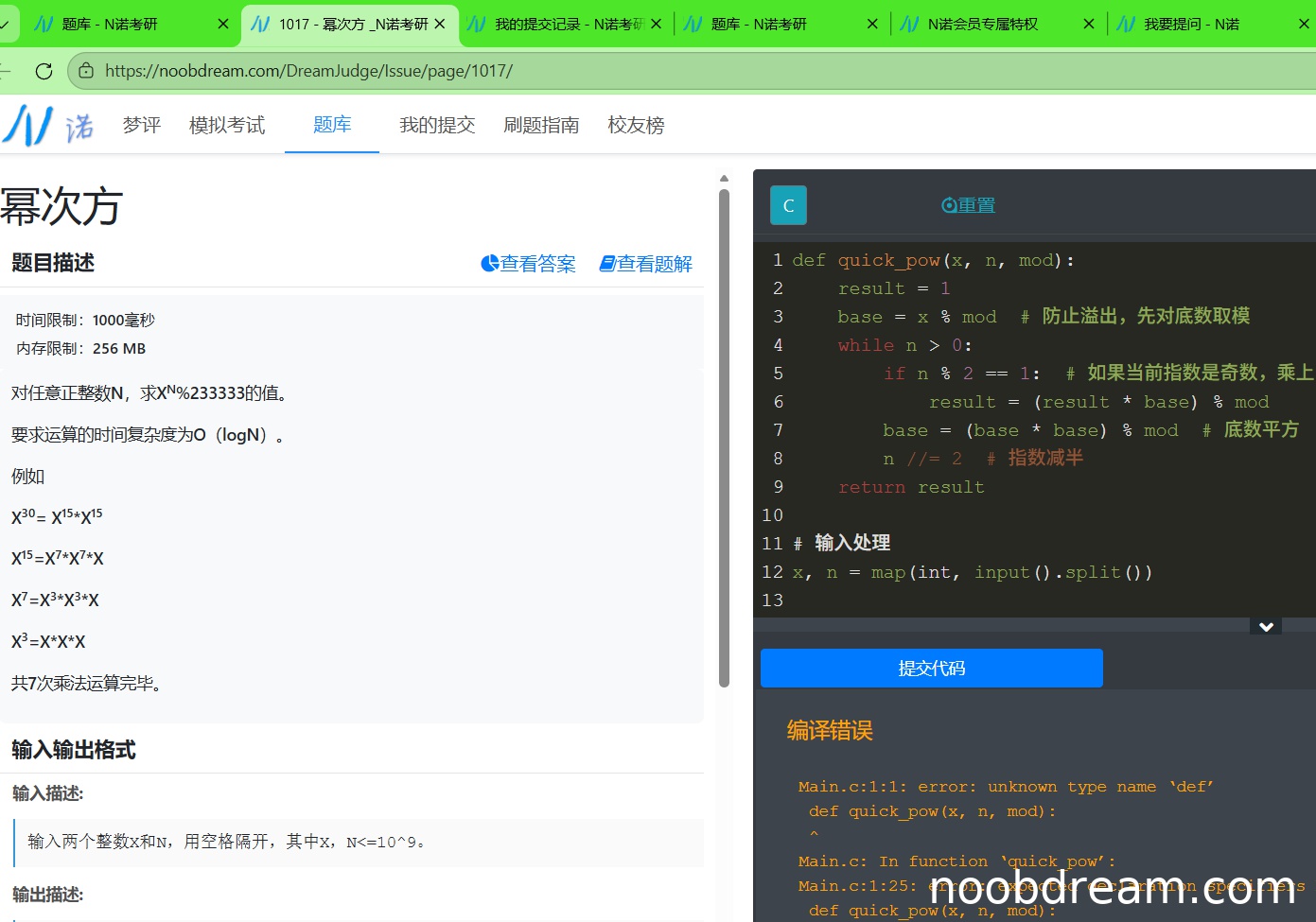 python可以提交,在导航栏,我的提交中查看,编译错误是因为用了f-string,这个是python3.6之后才支持的,修改后的正确代码:https://noobdream.com/DreamJudge/Issue/code/1048658/,注意提交时选择语言为python