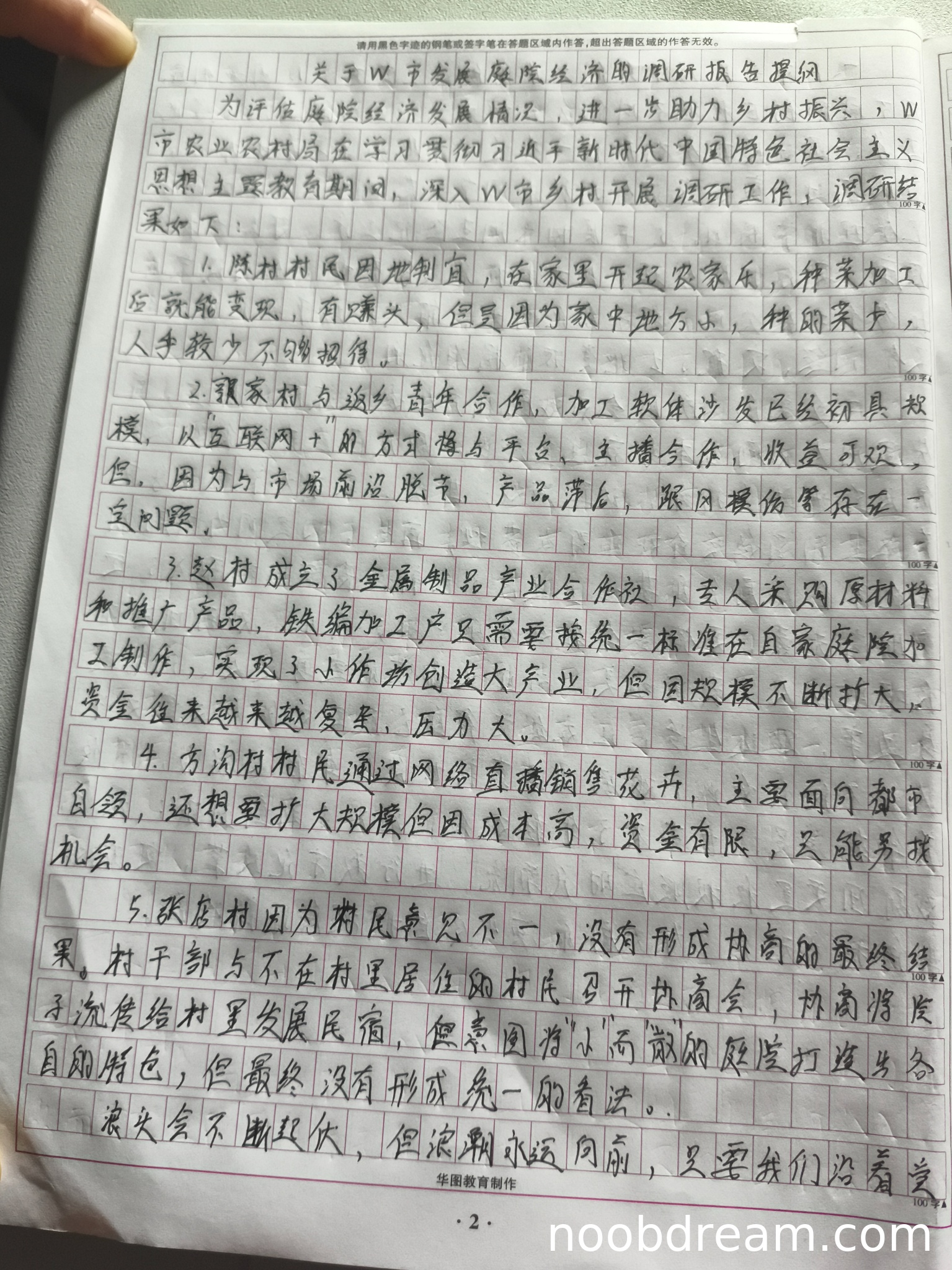 2. 内容上,能够紧扣给定资料,将陈村、郭家村、赵村、方沟村、张店村五个案例的情况进行了概括,基本涵盖了材料中提及的各类庭院经济模式(农家乐、加工产业、合作社、电商直播、民宿)及其面临的主要问题(空间、人手、市场脱节、资金、经营压力、意见分歧)。