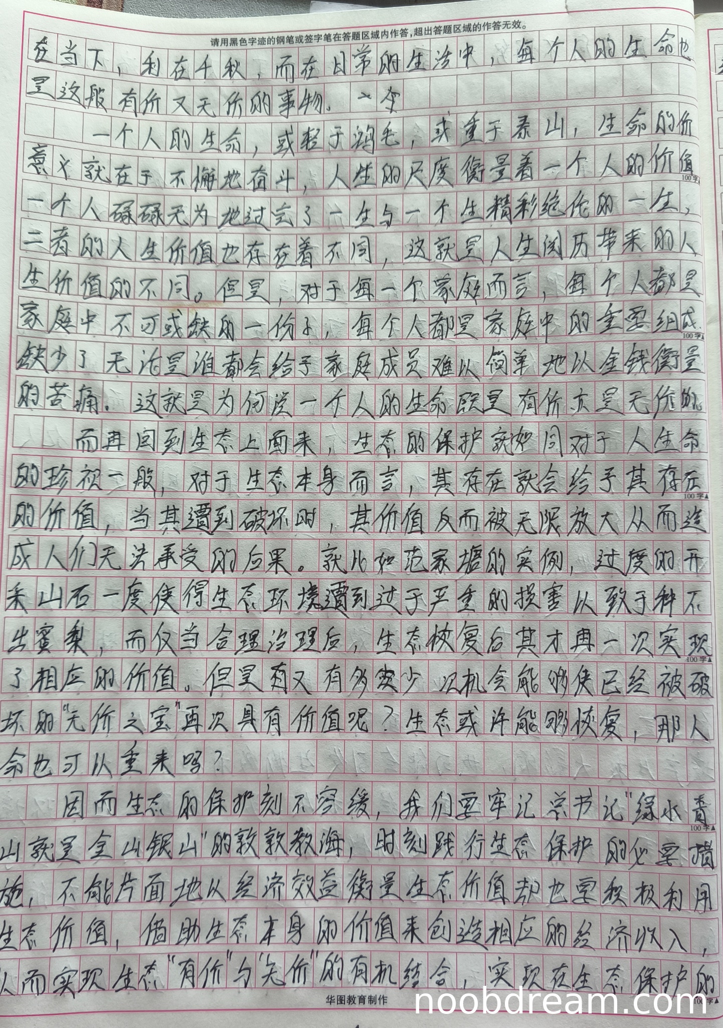 - 观点与立意:文章能够围绕“生态有价又无价”这一核心主题展开,并尝试联系“人的生命”进行论述,观点基本明确,符合题意。但立意深度不足,未能将“有价”与“无价”的辩证关系进行深刻、系统的理论阐述,对材料中“从卖石头到卖梨子再到卖生态”的产业升级和“生态产品价值实现”等深层内涵挖掘不够,更多停留在现象描述和简单类比层面。