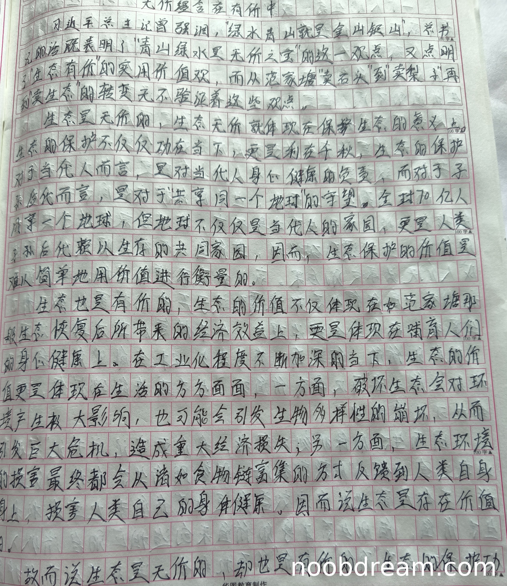 - 论据与分析:论据主要来源于给定材料(范家塘案例),并引用了“绿水青山就是金山银山”这一外部观点,符合要求。但对材料的运用较为浅显,主要是复述现象,缺乏深入的分析和提炼。对于“人的生命”部分的论据,属于自行联系实际,但与生态主题的融合分析不够深入,略显生硬和割裂。