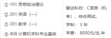 复试为差额复试。复试成绩总分为200分,其中笔试部分占100分,面试占60分,外语能力测试占40分,笔试、面试和外语听说能力成绩之和为复试成绩。复试成绩折合成百分制应不低于60分,否则视为复试不合格,不予录取。考生入学考试总成绩由初试成绩和复试成绩综合加权获得。科目:08:50-10:20 C语言;10:30-12:00专业综合(含专业英语翻译)