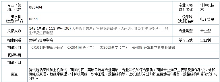 复试内容:英语口语与专业英语、专业知识和综合素质。全部采用面试方式进行,由学院指定3-5人组成的考核小组完成。其中,英语口语与专业英语、专业知识和综合素质各占1/3,总成绩60分为合格。复试专业知识主要涉及操作系统,数据库原理,计算机网络等。
