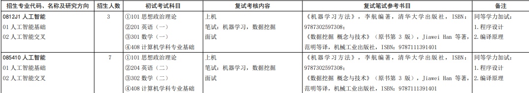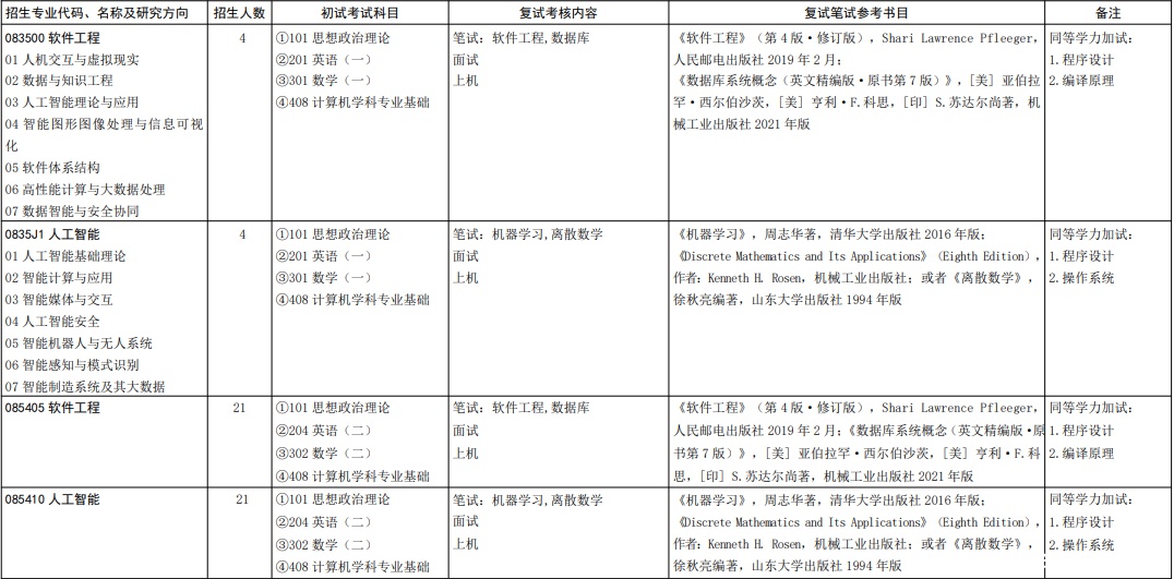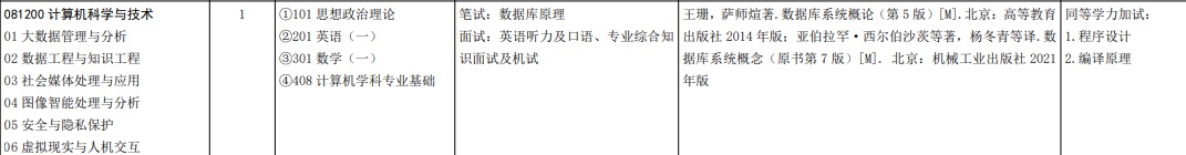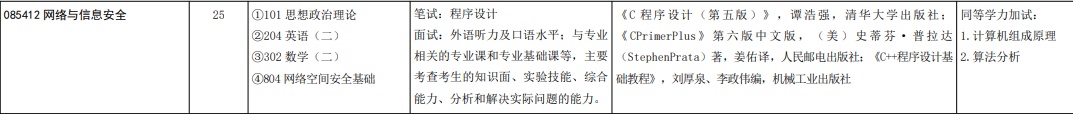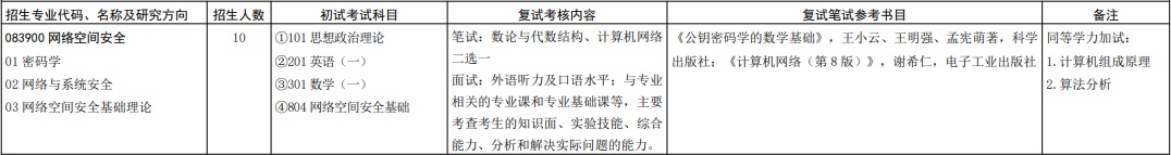 网络空间安全笔试:数论与代数结构、计算机网络 二选一 面试:01 方向,英语、概率论与数理 统计、密码学引论;02 方向,英语、 计算机系统、计算机安全基础;03 方 向,英语、线性代数、概率论与数理 统计、离散数学