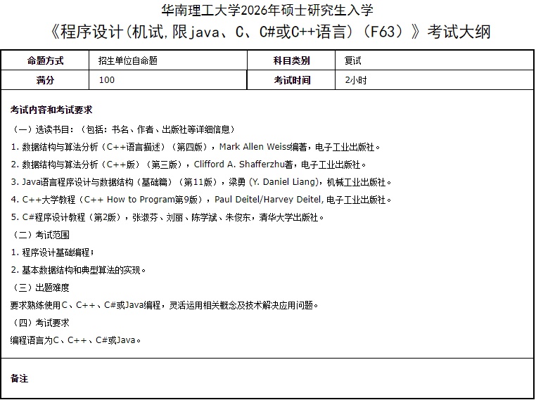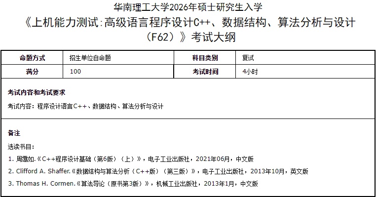 (1)专业课考核(100 分)根据2023年硕士生招生专业目录公布的复试科目进行,主要考核:高级语言程序设计 C++、数据结构、算法分析与设计;集成开发环境:MicrosoftVisual Studio 2012,Dev-Cpp 5.11,编程语言C++(往年4小时10道题)